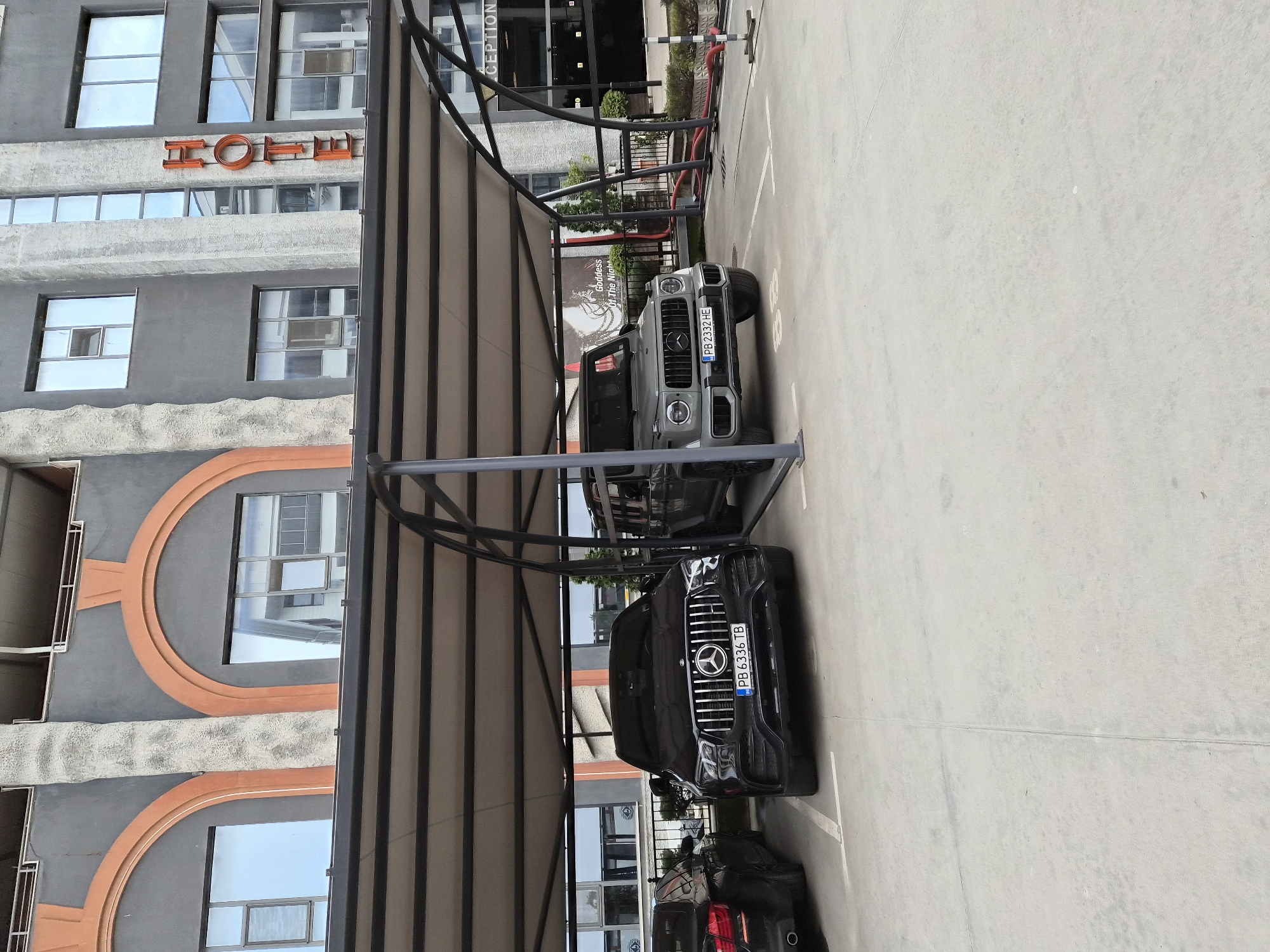 n outdoor parking area in Plovdiv, Bulgaria, likely associated with a hotel. The "HOTEL" sign is visible on the building. Several cars, including Mercedes-Benz G-Wagon and SUV models, are parked under a metal canopy. The license plates, "PB 2332 HE" and "PB 6336 TB," are visible. The area appears to be paved concrete. There are no people visible.