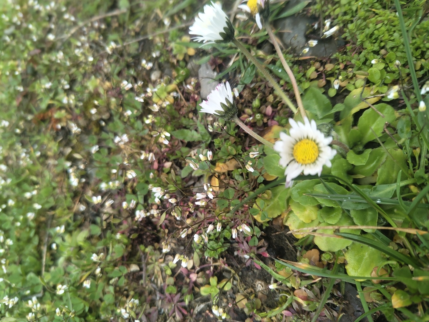 A close-up, ground-level photograph depicts a densely vegetated patch of ground in Bojevtsi, Bulgaria. The primary subjects are three white daisy-like flowers (*Bellis perennis*). One daisy, positioned slightly left of center in the foreground, is in sharp focus, displaying white ray petals surrounding a bright yellow disc. To its right, a second daisy is partially visible and out of focus. A third daisy, also out of focus, appears in the upper right quadrant. The ground is extensively covered with various small green plants, including numerous tiny white flowers, consistent with hairy bittercress (*Cardamine hirsuta*), and broad-leaved rosettes. Scattered blades of green grass are present, some exhibiting small water droplets. The underlying substrate appears to be dark, moist soil with occasional small stones and reddish-brown plant matter. The background consists of similar out-of-focus vegetation, forming a shallow depth of field. No human presence or activity is depicted.