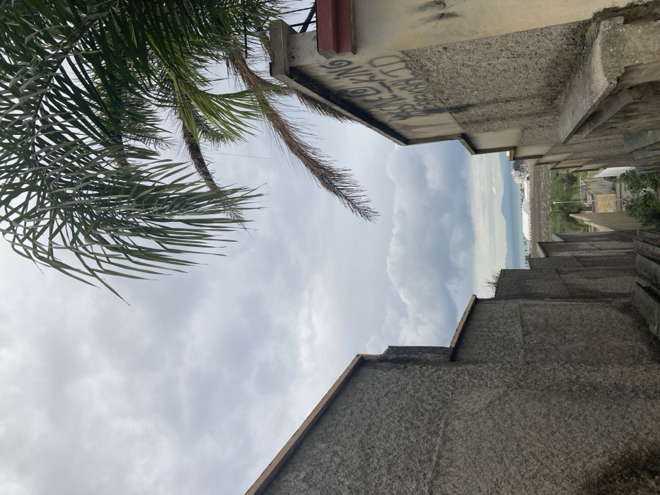 The image depicts a downward-sloping pedestrian passage or staircase in Tangier, Morocco, flanked by two rough-textured, light grey building walls under an overcast sky. In the immediate foreground, a substantial palm tree frond with green and desiccated leaves extends from the upper right corner, partially obscuring the sky. The wall on the right side of the passage features dark graffiti near its top, reading "YASSINE LE KING" and "BRAKHAI.D," accompanied by dark stains. Both the right and left walls have a light brown coping along their upper edges; the left wall displays a stepped architectural profile. The passage descends, revealing further sections of buildings or walls in the midground, interspersed with sparse green vegetation and a utility pole. In the background, a calm body of water, likely the sea, stretches to the horizon. A light-colored coastline is visible, featuring several large white tent-like structures on flat land near the water. Distant landmasses, possibly hills or mountains, are faintly visible across the water. No people are present in the scene.