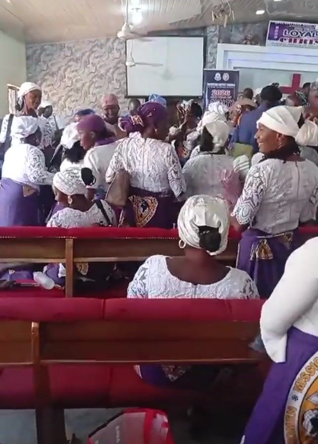 group of women, mostly wearing white lace tops and purple skirts with matching head coverings, gathered inside a building that appears to be a church. The women are standing or moving around, some are clapping and cheering, in front of wooden pews with red cushions. The room has light-colored walls and a white ceiling with a ceiling fan. A poster and windows can be seen on the walls. One woman is seen moving a pew.