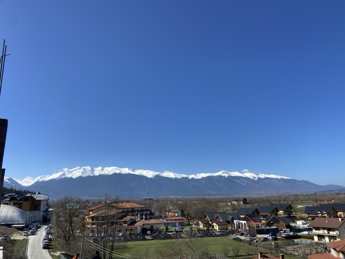 The image displays a panoramic, elevated view of Bania, Bulgaria, under a clear, brilliant blue sky. The most prominent feature is a long, snow-capped mountain range stretching horizontally across the mid-ground. Below the mountains, the landscape transitions into a valley containing the town. In the mid-ground, various structures comprise the town. On the left, a large building complex is visible, featuring a grey, curved or domed roof structure adjacent to multi-story buildings with reddish-brown tiled roofs. A paved road runs in front of this complex, lined with parked passenger vehicles. Further right and extending across the mid-ground, numerous residential and commercial buildings are present, characterized by diverse architectural styles, predominantly featuring red-tiled roofs. Towards the far right, a cluster of modern-looking buildings with dark, possibly wooden, roofs are arranged in a more uniform development. Green grassy fields and scattered trees, some appearing bare or with minimal foliage, are interspersed among the buildings. Utility poles and wires are discernible in the lower mid-ground. In the immediate foreground on the far left, a dark, vertical structural element with exposed rebar or metal rods partially obstructs the view, indicating the image was captured from an elevated construction or balcony. No individuals or explicit actions are visible. The scene suggests late winter or early spring conditions due to the snow on the mountains and emerging greenery in the valley, illuminated by bright daylight.
