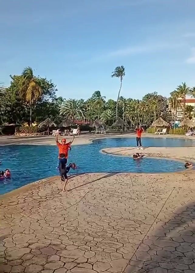 large, lagoon-style swimming pool surrounded by a stone-paved deck. Lush tropical vegetation, including palm trees and small thatched-roof huts, borders the pool area. People are swimming in the pool. Two men wearing orange shirts stand near the pool, one on the deck, one in the water, both apparently pool staff. The man on the deck, wearing an orange shirt, is teaching a boy how to spin a hula hoop. The sky is blue, and the lighting indicates it is daytime.