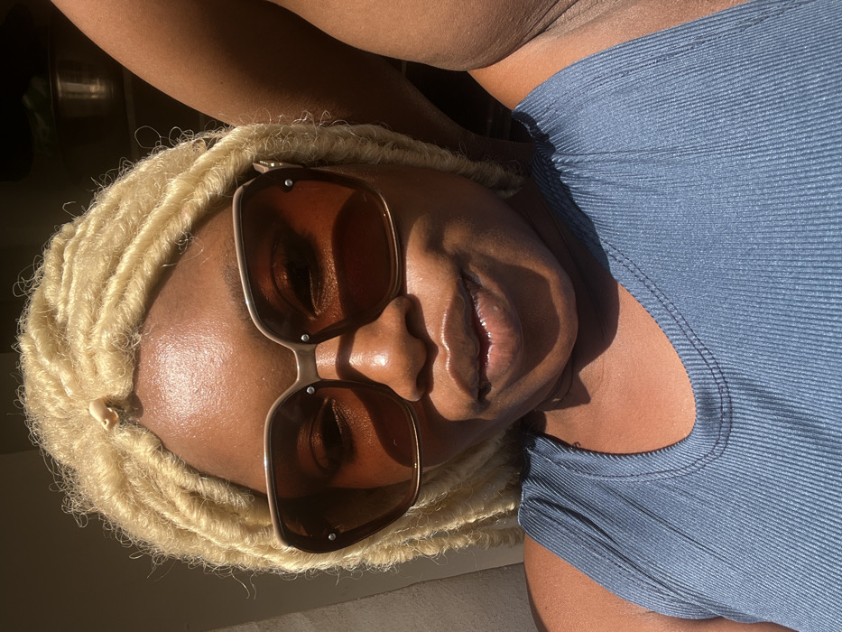 A medium close-up shot captures an individual with dark skin, featuring blonde dreadlocks and a small, light-colored hair accessory positioned near the hairline above the forehead. The individual is located in Gwarinpa, Nigeria. They wear large, square-framed sunglasses with dark brown lenses and light brown frames. The lips are slightly parted and appear glossy. The subject is wearing a ribbed, blue-grey sleeveless top. Strong direct sunlight illuminates the face, creating distinct shadows beneath the sunglasses and chin. The background is largely dark and out of focus, with a metallic object, possibly a bowl or pot, partially visible on the upper right, and a light-colored vertical surface faintly discernible on the far left.