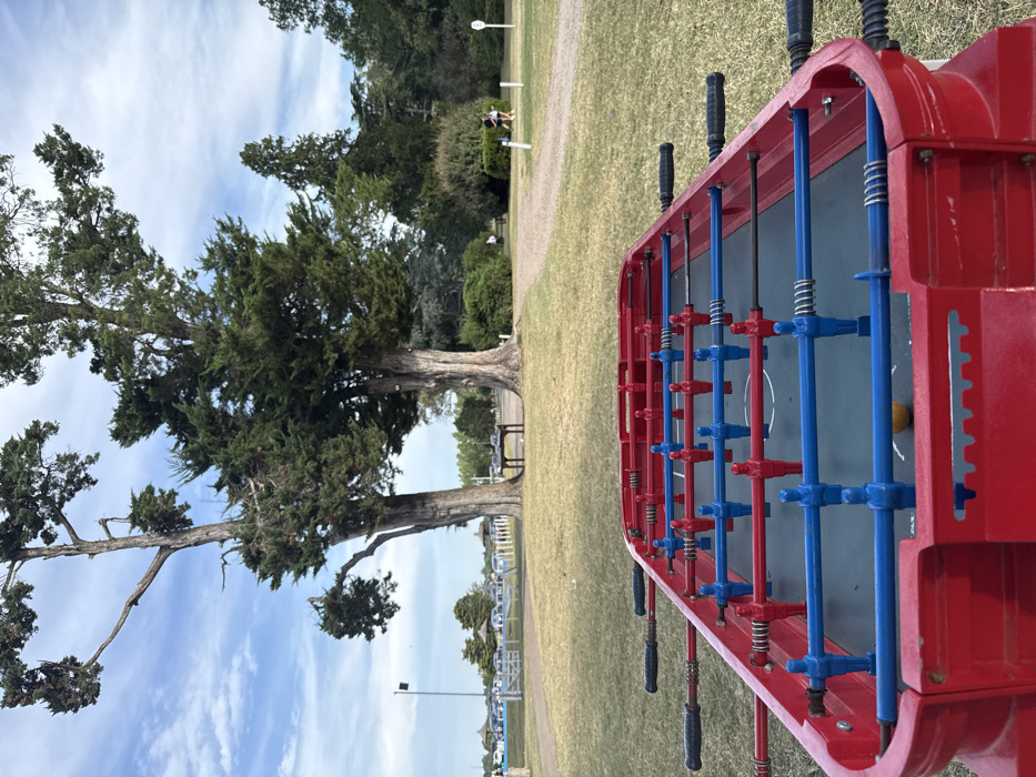 A foosball table stands in a park-like setting. The table is red with blue and red players, and black handles. Behind it, a grassy area extends towards large trees, with a clear blue sky overhead. In the distance, benches and people can be seen, along with a row of lights. The scene conveys a casual, outdoor recreational area.