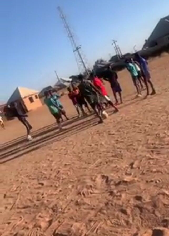 A group of approximately a dozen young men are gathered in a sandy, dirt-covered field. They are dressed in a variety of casual clothing, including t-shirts, shorts, and athletic wear, with colors like red, green, and blue visible. The men are standing in a loose circle, passing and kicking a soccer ball amongst themselves. The camera angle is slightly tilted, providing a wide shot of the scene. In the background, there are a few simple buildings, a tall metal communication tower, and some scattered power lines. The sky is clear and blue, suggesting a sunny day. The ground is dry and marked with footprints, indicating the area is frequently used. The overall impression is that of a casual, informal gathering for a friendly game of soccer.