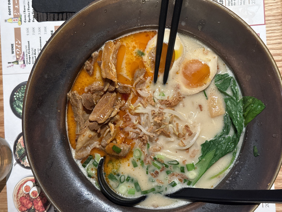 The image displays a close-up, overhead view of a large bowl of ramen centered on a table. The dark brown ceramic bowl contains a creamy, opaque broth topped with a distinct orange-red chili oil layer. Visible ingredients include several pieces of braised pork belly, two halves of soft-boiled eggs with bright orange yolks, white ramen noodles, chopped green onions, white bean sprouts, crispy fried shallots, large dark green leafy vegetables, and light yellow bamboo shoots. A black flat-bottomed ramen spoon rests on the left side of the bowl, partially submerged. A pair of black chopsticks is positioned on the right side, resting on the rim of the bowl with their tips submerged in the broth near one of the egg halves. The background reveals a light-colored table surface partially covered by a paper placemat or menu. The visible menu section on the upper right lists "WINE" and "SOFT DRINK" in both English and Japanese characters, with specific items like "Coupe Crémant" and "Provence" listed with prices in Euros (€), such as 9,50€. Circular images of other Asian dishes are visible on the menu section to the left. The combination of Euro currency, French language on the menu, and Japanese cuisine indicates the scene is located in the city of Luxembourg, Luxembourg.