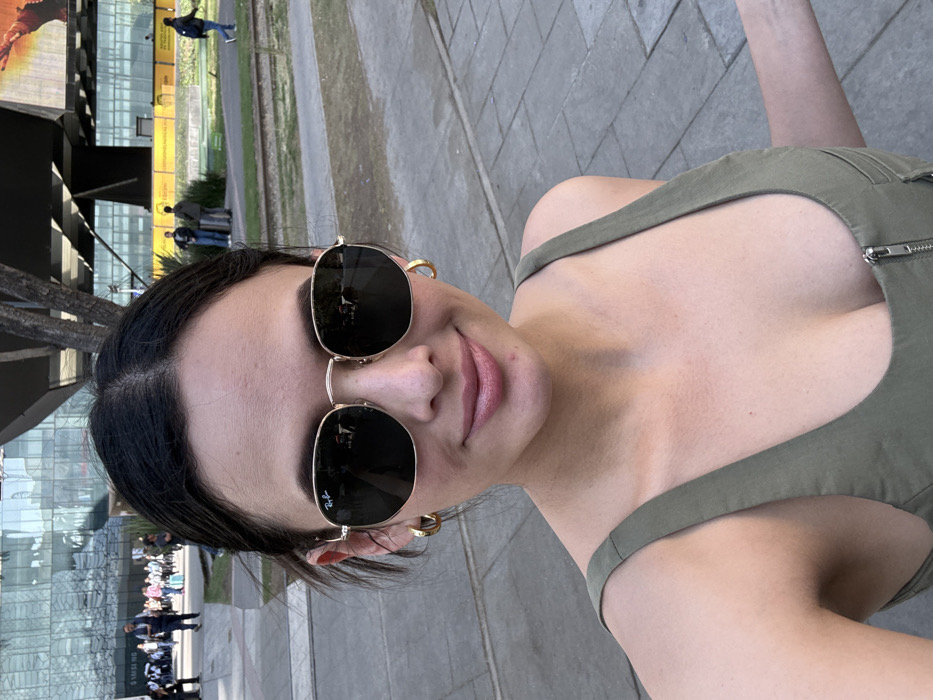 A woman poses outdoors wearing a muted green tank top and gold hoop earrings. She sports dark sunglasses with a gold frame, and her dark hair is parted down the middle. The background features a modern building with glass and architectural elements, along with glimpses of people walking by on a paved area. The photo has an informal, selfie-like quality, with the camera held at an angle.