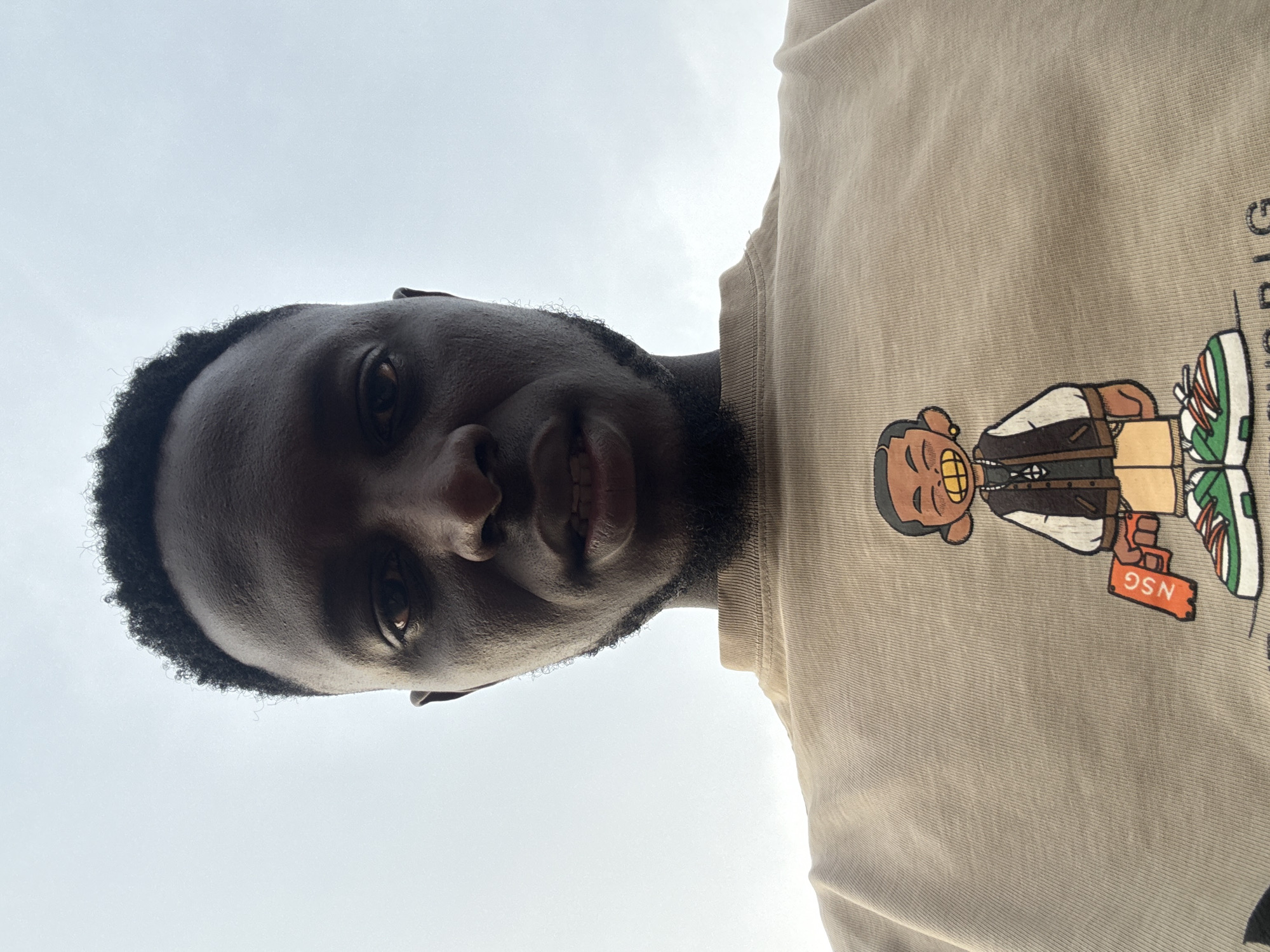 A low-angle close-up photograph shows a dark-skinned man. He has short black hair and a beard. He is wearing a tan t-shirt with a cartoon graphic that shows a character with gold teeth, wearing a vest, and holding a sign labeled "NSG." The background consists of a light gray sky. The photograph was taken in Lafia, Nigeria.