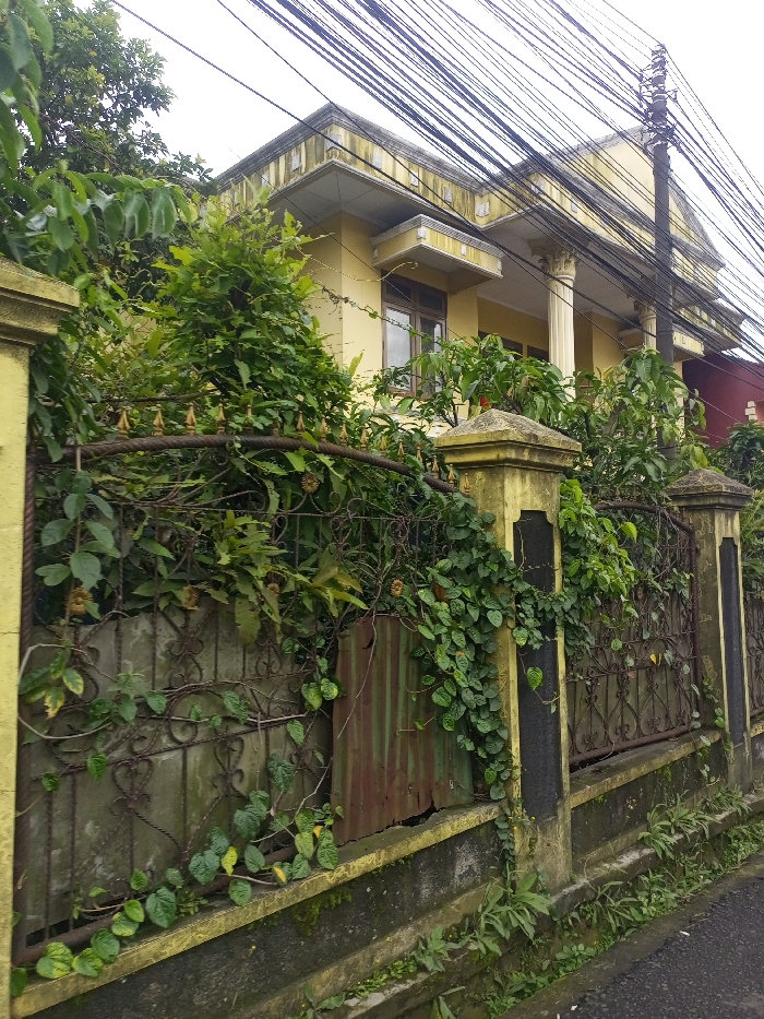 A yellow building with columns stands behind a weathered fence covered in vines and vegetation