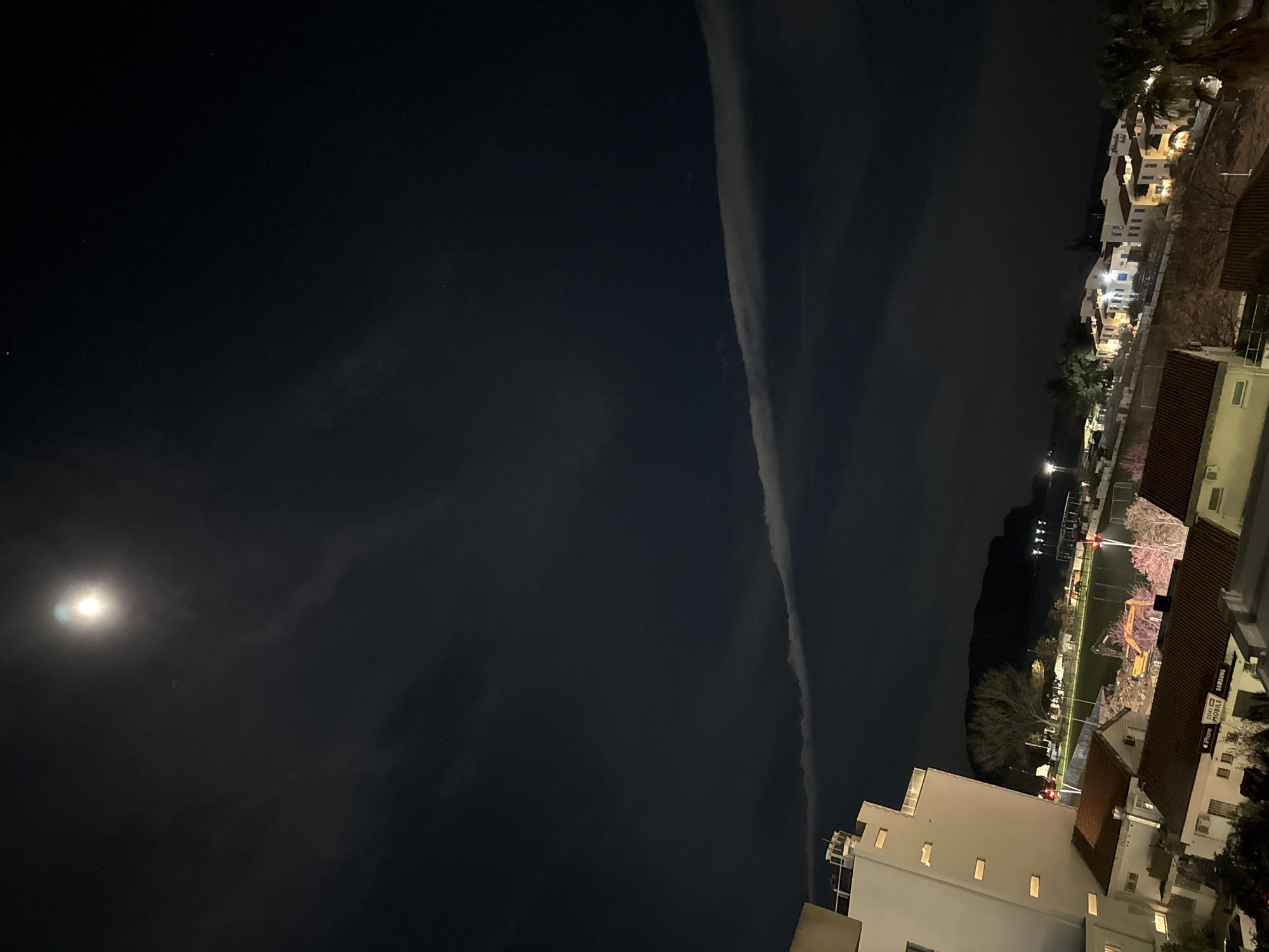 night view in Budva, Montenegro. A bright moon is visible in the dark sky, accompanied by a prominent cloud formation stretching upwards. The cityscape on the right side of the frame comprises buildings with lit windows, suggesting residential or commercial activity. Lights are visible near the water, potentially indicating a waterfront area. Some trees are also visible, adding to the urban landscape. The buildings appear to be constructed in a modern style, with white facades and clean lines. There is limited detail in the foreground, but it seems to show the top of a building with some equipment.