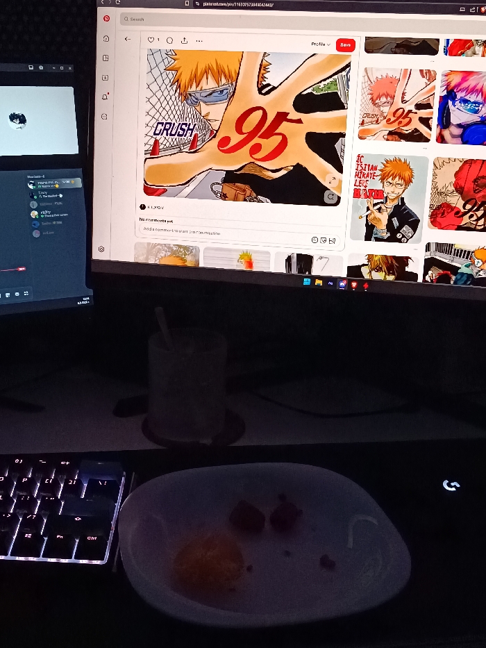 This image depicts a dimly lit indoor desk environment located in Novi han, Bulgaria. A multi-monitor computer setup is active. The primary monitor on the right displays a Pinterest webpage featuring an anime-style illustration of Ichigo Kurosaki from Bleach, characterized by orange hair, blue sunglasses, and a large hand with the words "CRUSH" and "95" written on it. The screen also shows multiple related images and a visible URL (`pinterest.com/pin/1163757334...`). To the left, a secondary monitor displays a dark profile picture, and below it, a third monitor shows a chat application interface, likely Discord, with several user names and text activity. On the desk, a white mechanical keyboard with glowing white backlighting is positioned on the left. A clear glass with a straw, containing a beverage, rests on a dark coaster between the main monitor and the keyboard. To the right of the keyboard, in the foreground, a white, irregularly shaped plate contains remnants of food, specifically an orange, stringy substance and two small, dark red pieces. A faintly illuminated "G" logo, indicating a Logitech device (likely a mouse), is partially visible on the dark desk surface to the right of the plate. The background suggests a dark, possibly textured wall or panel behind the monitors. No individuals are visible in the scene.