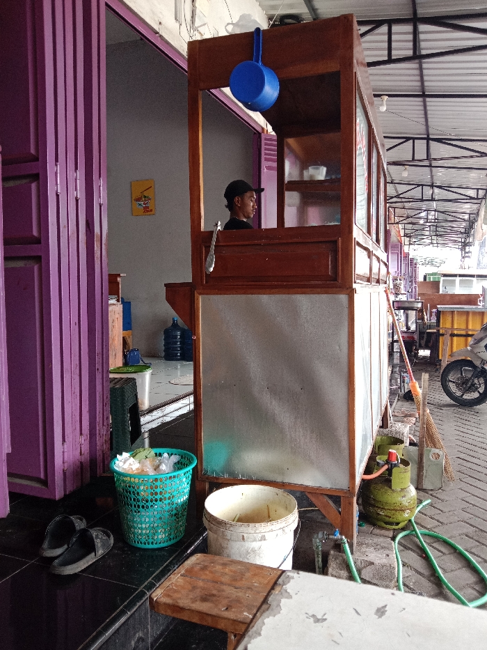 A wooden food stall stands outside a building with purple accordion doors. A person in a black cap is visible inside the stall. A blue bucket hangs from the top. A green trash can, a white bucket, and a wooden stool sit near the stall. A propane tank and a green hose are behind it. A motorcycle is parked on the street in the background.