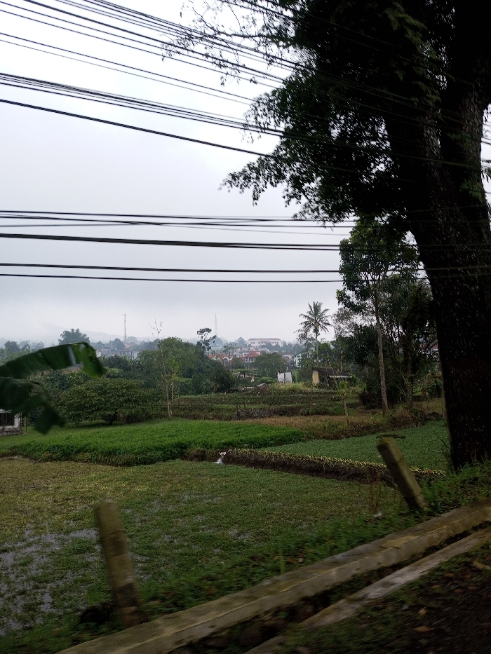 An outdoor, wide-angle image depicts an overcast landscape in YonPhoogla, Bhutan. The scene transitions from agricultural fields in the foreground to a residential area and distant hills in the background. In the immediate foreground, a dark, textured tree trunk occupies the right side, extending vertically with some dark green foliage visible at the top right. Below this tree, two parallel, rectangular concrete structures or posts are partially visible, angled along the bottom right edge. The lower left foreground shows a large, dark green banana leaf. The midground features several tiered agricultural fields or paddies. The field closest to the viewer on the left is wet or flooded with sparse green vegetation. Further back, rows of denser green crops are visible, interspersed with natural foliage and a few scattered trees. A prominent, tall palm tree stands to the right of the central midground. A small, light-colored structure with a dark roof is partially visible among the trees slightly right of center. In the background, a village or small town is visible, consisting of numerous houses with light-colored facades and dark or reddish-brown roofs, situated on a gentle incline. Above the rooftops, multiple tall, slender communication towers are discernible. Distant hills or mountains are shrouded in haze or mist, blending with the uniformly light grey, overcast sky. Multiple parallel, dark electrical or communication wires traverse horizontally across the upper half of the frame, passing in front of the large tree on the right. No people or animals are visible, and no direct actions or interactions are depicted. The overall atmosphere is muted due to the overcast conditions.
