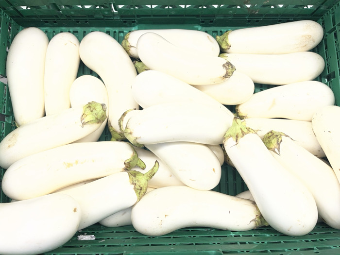 - "A green plastic crate holds a pile of white eggplants" by FM-dFHXv1, licensed under CC BY 4.0