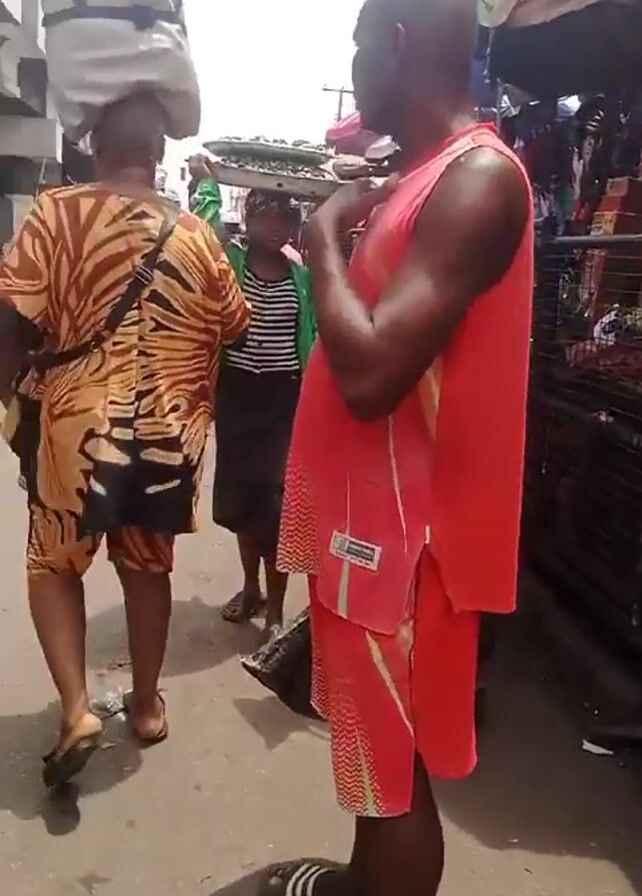 bustling outdoor market setting. People are walking along a paved road, many carrying items on their heads or in their hands. Some individuals are wearing casual clothing like t-shirts and shorts, while others are in more traditional attire such as long dresses. The environment includes overhead structures, likely part of the market's infrastructure, and various vendor stalls with merchandise on display. The camera moves with the people, capturing the lively atmosphere of the market.
