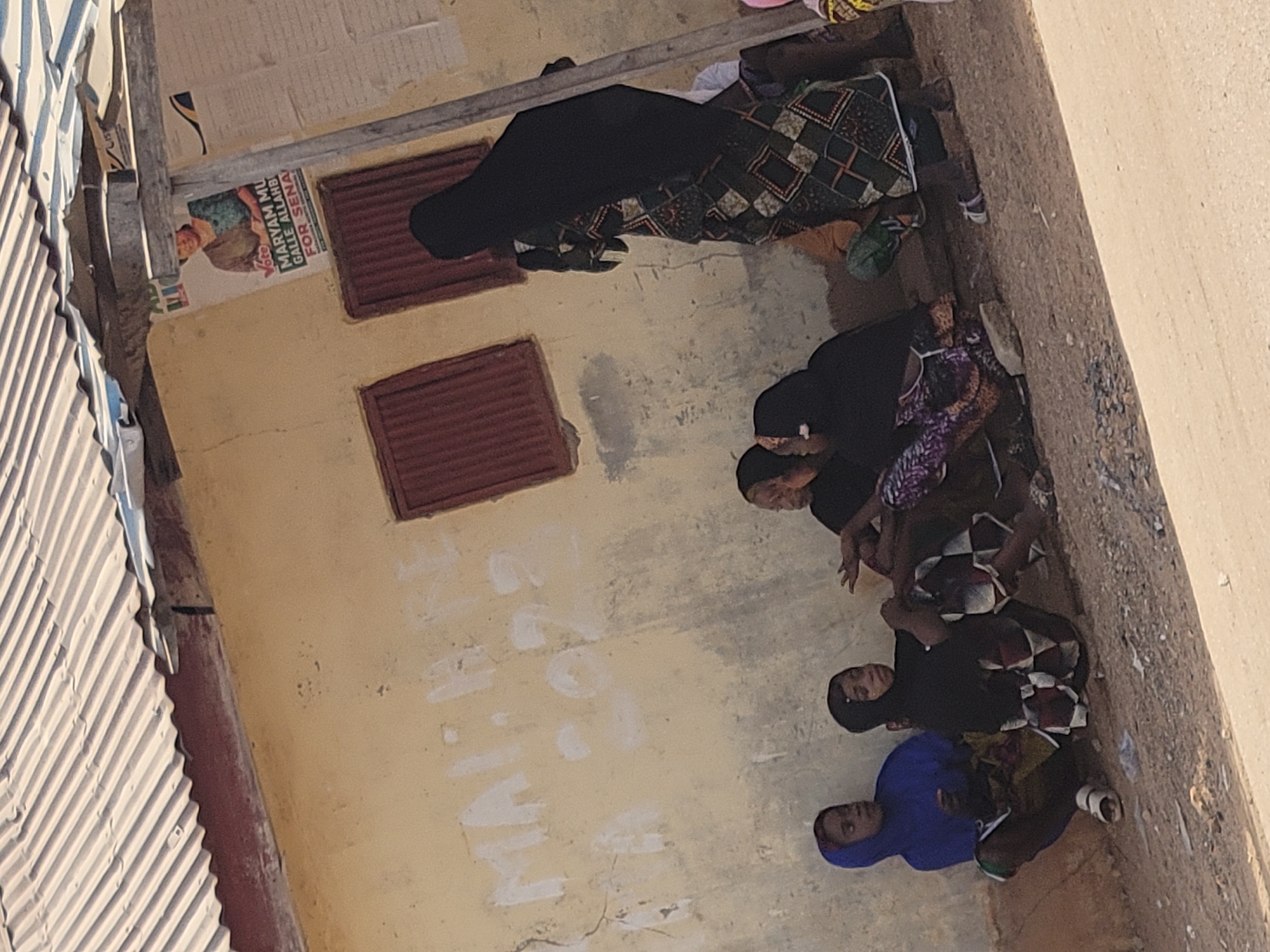 An outdoor scene in Nassarawa Egon, Nigeria, depicts a group of individuals gathered near the exterior wall of a building under daylight conditions