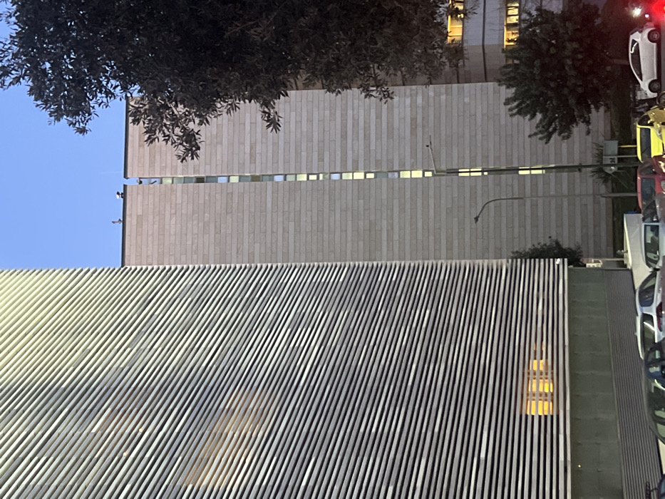 The image depicts an urban street scene in Athens, Greece, observed from a low angle, looking upwards at a complex of modern buildings. The primary structures visible are located at or near the Bank of Greece headquarters, specifically along Panepistimiou Street. To the left, a multi-story building dominates the frame with a facade composed of numerous horizontal, light-grey louvers or fins. Behind these louvers, a single rectangular window on a lower floor emits a warm, yellow-orange light. Below this section, a different, possibly reflective, material is visible on the building's base. Centrally, a taller, narrower building constructed from light-colored, rectangular stone blocks stands adjacent to the louvered building. A prominent vertical strip of windows runs down its center, revealing several illuminated interior spaces with cool white light. On the flat roof of this stone building, two small, dark, human figures are visible standing upright near the edge. To the right, a large, dark-leaved tree partially obscures a less distinct building behind the stone structure, which also shows illuminated windows. At street level, in the lower portion of the image, multiple passenger vehicles (cars in white, silver, red, and yellow) are parked or stationary. A tall, grey streetlamp with a curved arm is positioned between the louvered and stone buildings. The sky above is clear and light blue, indicating ambient daylight, possibly late afternoon or early evening, contrasting with the artificial lights visible in the buildings.