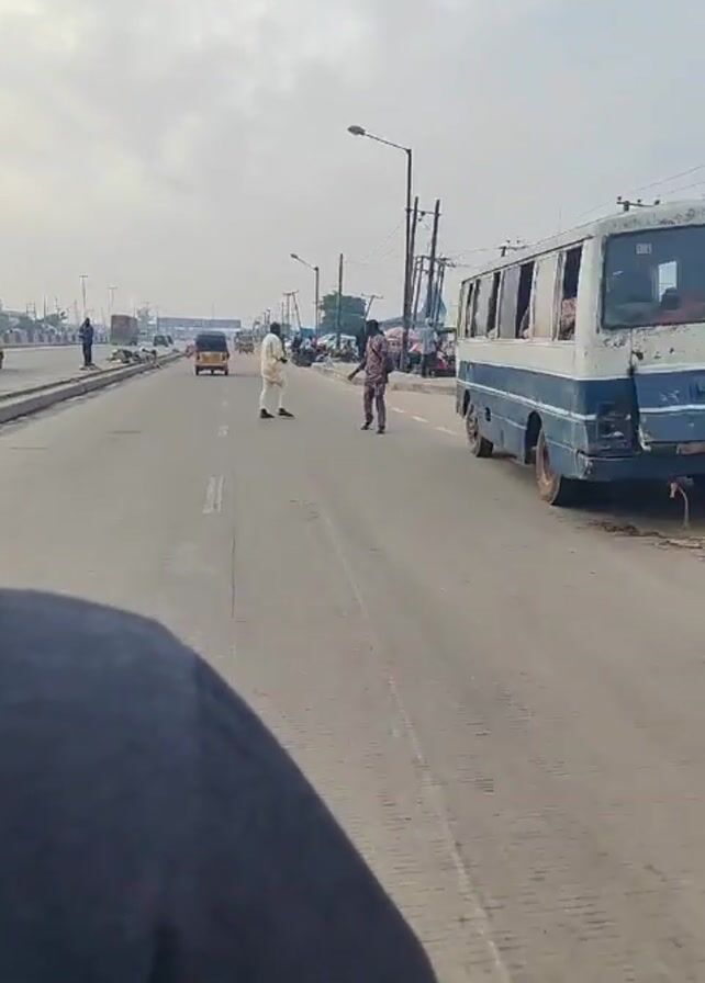 The video appears to be shot from the back of a moving vehicle on a wide road. The road has multiple lanes and is lined with streetlights. Several yellow three-wheeled vehicles known as "keke napep" are driving along the road. Pedestrians are walking on the side of the road. A dilapidated white van is parked on the side of the road. There are electrical poles with numerous wires on both sides of the road. The sky is overcast.