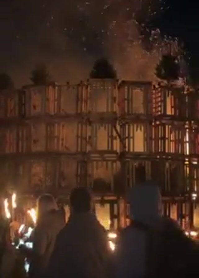 large, multi-tiered wooden structure burning at night. The structure is made of what appear to be wooden pallets or similar materials, stacked to create a castle-like effect. Flames are visible throughout the structure, and sparks rise into the dark sky. In the foreground, several people stand watching the fire. They appear to be silhouetted against the light of the flames. Some individuals hold torches. The environment appears to be an open field. The overall scene suggests a bonfire event or festival.