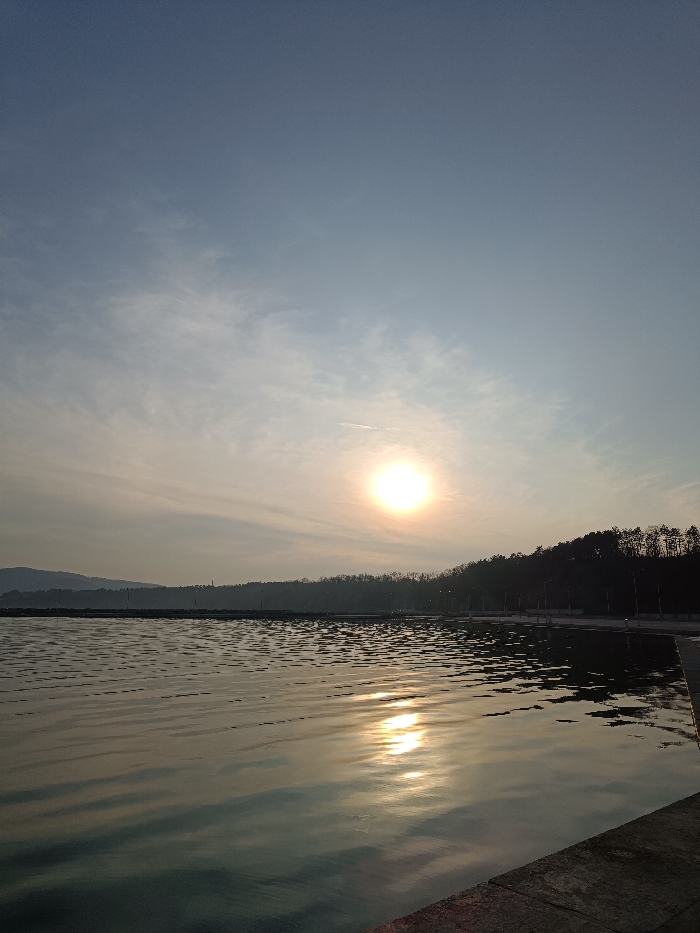 The image captures a panoramic view of a coastal or lakeside environment in Byala, Bulgaria, during either sunrise or sunset. The sky, occupying the upper two-thirds of the frame, displays a gradient from light blue at the top to a pale yellow and orange near the horizon, indicative of low sun angle. Wispy, scattered clouds are present, with a faint contrail visible in the upper-middle sky. A bright, circular sun, emitting a strong glow, is positioned in the middle-right section of the sky, just above the horizon. Below the horizon, a calm body of water fills the lower portion of the image. The sun's reflection creates a prominent vertical column of shimmering light on the water's surface, which exhibits gentle ripples. In the mid-ground, a dark, undulating landmass or tree-covered hill forms the distant left horizon. To the right, a denser, tree-lined hill slopes down to the water's edge, appearing as a dark silhouette against the brighter sky. Along the base of this right-side landmass, a paved embankment or promenade is visible, extending into the distance and featuring a series of evenly spaced streetlights. The immediate foreground on the bottom right corner shows the rough texture of a concrete structure, suggesting the viewpoint is from a pier or shoreline platform. No people or active subjects are present in the scene.
