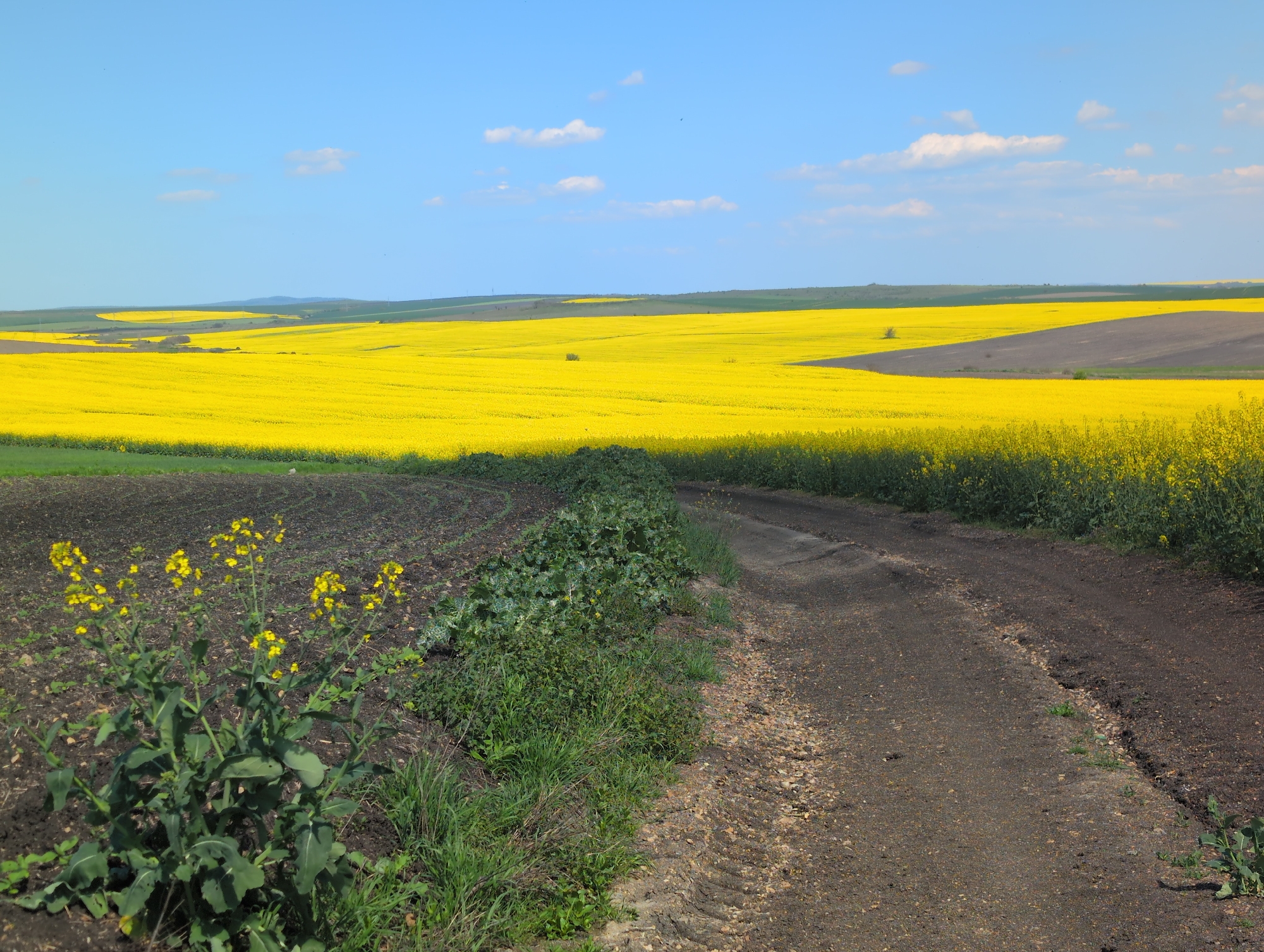 The image depicts a rural scene near Elhovo, Bulgaria. A dirt road runs through the foreground, transitioning from gravelly textures to a dark, compacted surface. Flanking the road are patches of vegetation, including low-lying green plants, weeds, and some flowering rapeseed plants. The road separates a dark, plowed field on the left with sparse vegetation from a grassy area to the right. In the background, expansive fields of blooming yellow rapeseed stretch towards the horizon under a blue sky dotted with scattered white clouds. A line of low hills is visible on the horizon. There is no evidence of human activity in the immediate scene.