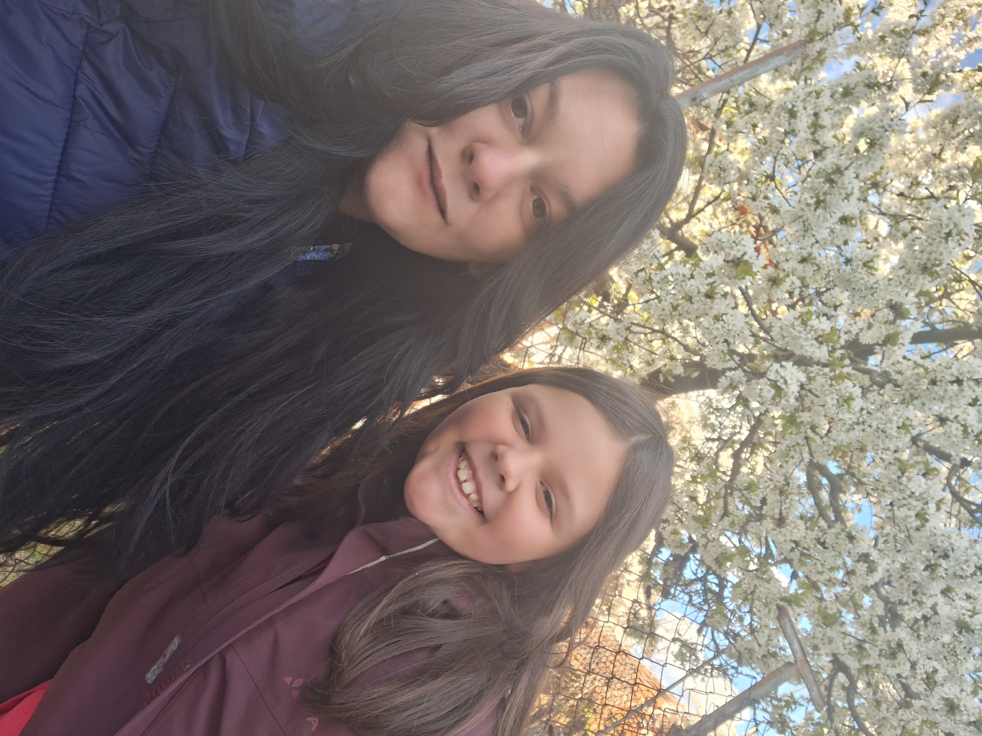 Two people, likely a mother and daughter, are taking a selfie outdoors. The woman has long dark hair and is wearing a blue puffy jacket. The girl has shoulder-length brown hair and is wearing a maroon jacket. Both are smiling. Behind them is a tree in full bloom with white flowers and a chain-link fence. The location is likely in the city of Goce Delchev, Bulgaria. The time of year is likely spring.