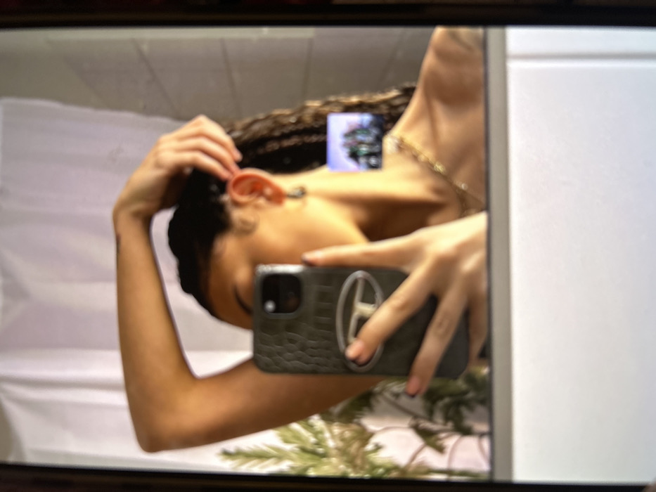 A mirrored selfie shows a slender person, possibly a woman, holding a dark, textured phone with a pop socket. She wears a gold chain necklace and has braided hair. Her hand is near her ear, as if adjusting her hair. The background features a white surface, possibly a wall or door, and a blurry green object, perhaps foliage. The reflection reveals part of the person's face and arm, creating a slightly distorted perspective.