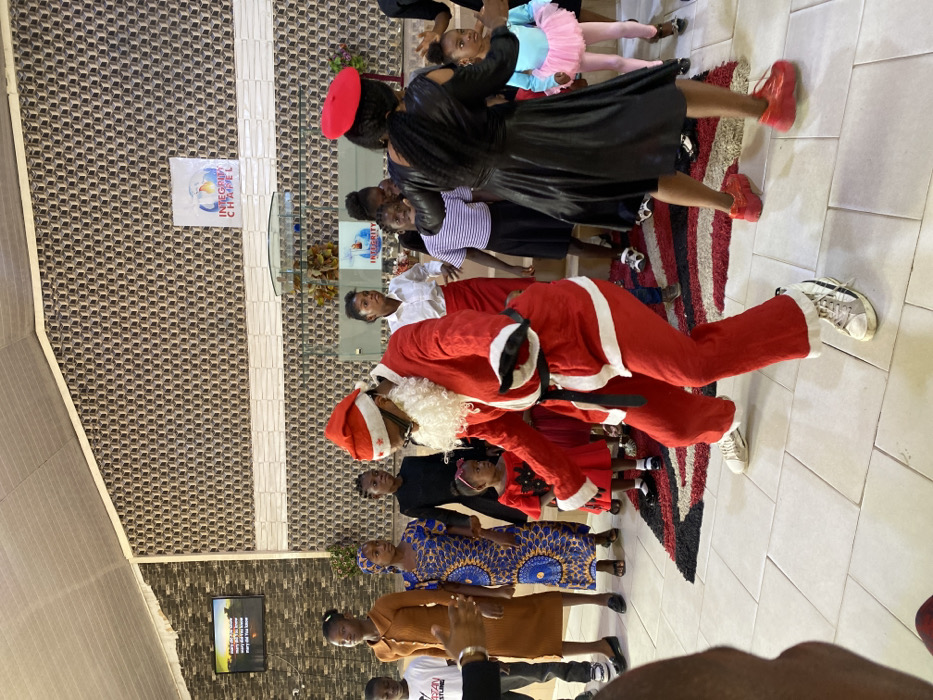 The scene depicts an indoor festive gathering at Integrity Chapel in Lokoja, Nigeria