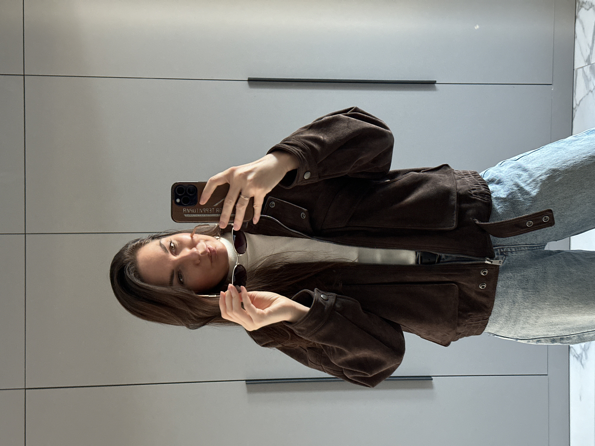 The image is a selfie of a young woman, likely in her late teens or early twenties. She has fair skin, brown hair, and is wearing light blue jeans, a white turtleneck sweater, and a brown suede jacket. She is holding a pair of sunglasses in one hand and a phone in the other, presumably taking the selfie. The background appears to be an interior setting with light gray, smooth-surfaced cabinets or wall panels. There is a glimpse of a white marble or tile surface to the far right. The location is not evident. This image is likely taken in Chaikovsky, Russia.
