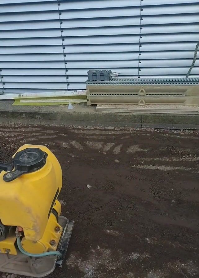 n area under construction or renovation. A yellow plate compactor is sitting on a patch of dirt and gravel. Adjacent to this is a building with closed white blinds and light brown wood paneling. Near the building are containers of blue and green liquid. The surrounding area is mostly dirt and gravel with some construction materials like wooden planks, metal pieces, and a large white bag of Steffes stone. Across the street, there is a building with white walls and a blue fence. Green trees are visible in the background.