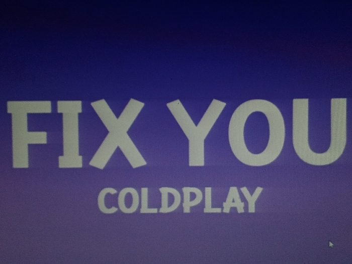 The scene, situated in the city of Beipa, Liberia, depicts a static digital display. The background features a vertical color gradient, transitioning from a dark royal blue in the upper portion to a lighter lavender purple in the lower portion. Centered horizontally on this background are two lines of white, sans-serif text. The primary line, in a larger capital font, reads "FIX YOU". Directly below it, in a smaller capital font, the secondary line reads "COLDPLAY". A faint white mouse cursor is visible in the bottom right quadrant of the image. No individuals, direct actions, or other discernible objects or interactions are present within the depicted screen content.