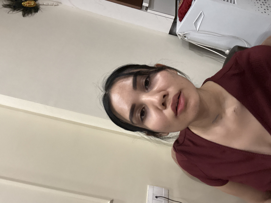 The scene is identified as being within an indoor setting in the city of Howrah, India. The image captures an adult female, seen from the chest up, positioned slightly off-center and looking directly at the camera. She has dark hair, pulled back with some strands loose around her face, and a neutral facial expression. She wears a dark red V-neck garment. A white earbud is visible in her right ear, and a faint mark or line is present on her left neck. The background features light-colored walls, likely beige or off-white. On the left wall, a white electrical switchboard with two switches and a three-pin socket is mounted, with a black cable plugged into it. In the upper right corner, a decorative item composed of dark feathers and a central gold-colored embellishment is affixed to the wall. To the right of the individual, a white appliance, possibly an air cooler or humidifier with a patterned lower section, is partially visible, with a light-colored cord connected. A red fabric item is also partially visible on or behind this appliance.
