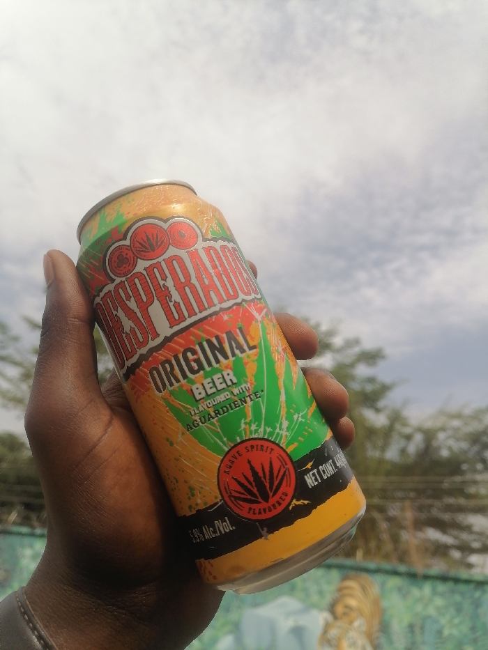A dark-skinned left hand firmly grasps a "Desperados Original Beer" can, angled slightly upward against a blurred background