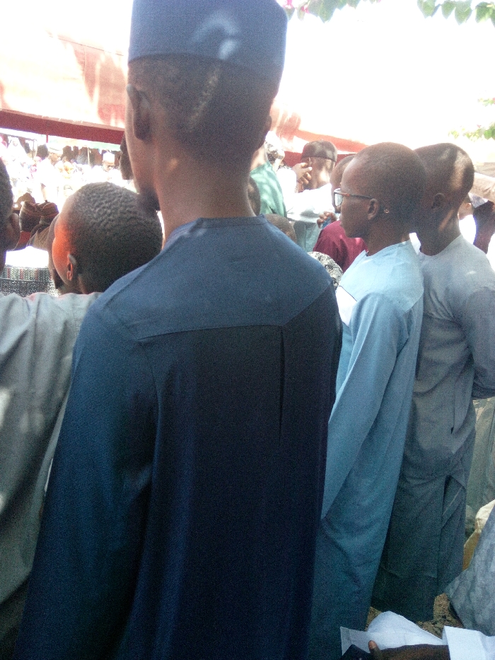 The scene depicts an outdoor gathering in Gawuna, Nigeria, under bright daylight conditions