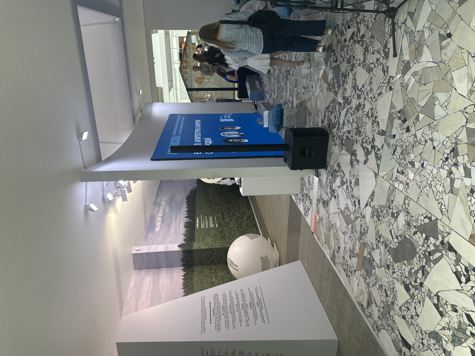 The scene is an exhibition space in the "Manezh" central exhibition hall in Moscow, Russia (latitude: 55
