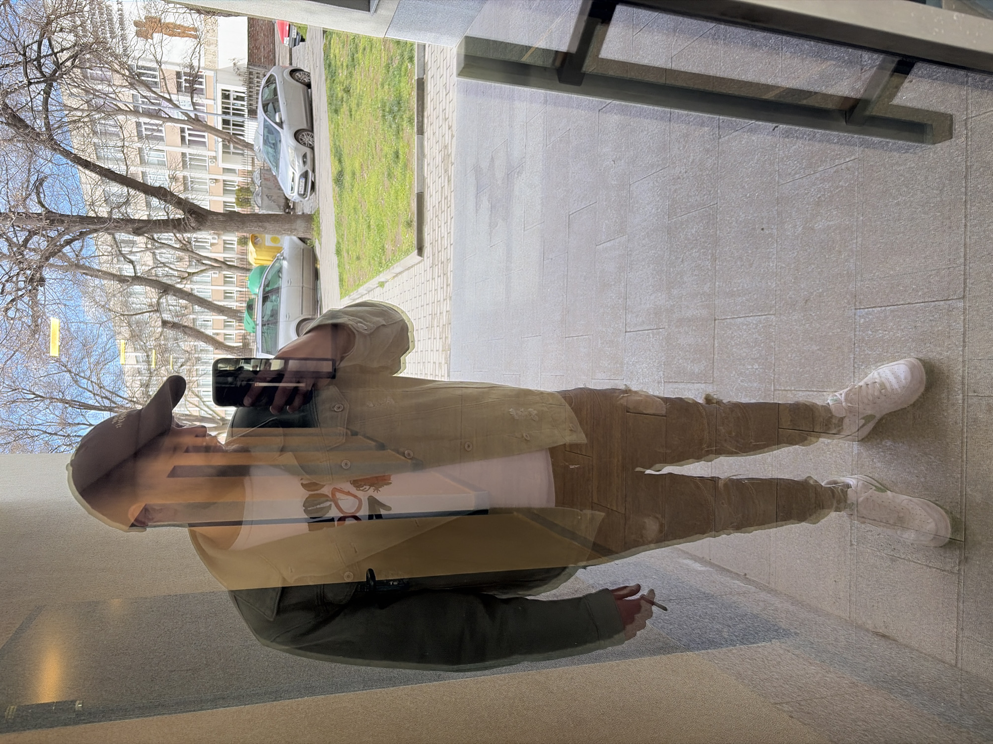 The image captures a full-body reflection of an individual standing on a light-colored tiled surface, appearing to be indoors or in an entranceway, while simultaneously revealing an exterior street scene through the transparent medium. The individual, presumed male, wears a dark brown baseball cap, a light olive green utility jacket over a white t-shirt with a graphic design, light brown cargo-style pants, and white sneakers (likely Nike Air Force 1s). The person holds a dark-colored smartphone aloft with their right hand, suggesting they are taking a selfie or a reflective photograph, and a lit cigarette is held in their left hand. Through the glass, a street environment is visible. A narrow strip of green grass separates a paved sidewalk from a street where two vehicles are parked: a silver station wagon and a silver Ford Focus hatchback. Yellow and gray refuse containers are positioned behind the parked cars. Bare-branched deciduous trees line the street. In the background stands a multi-story building with numerous windows, painted in light beige and white tones. A large sign on the building's facade explicitly identifies the location as "ТЕХНИЧЕСКИ УНИВЕРСИТЕТ - СОФИЯ" (Technical University - Sofia), with "ФИЛИАЛ ПЛОВДИВ" (Plovdiv Branch) below it, also featuring the historical acronym "ВМЕИ." This places the scene in front of the Technical University of Sofia, Plovdiv Branch, in Plovdiv, Bulgaria. The sky is clear and bright.