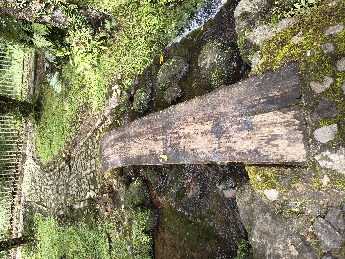 This image depicts a verdant outdoor scene in an unknown city in Vietnam, centered on a rustic pedestrian crossing. A single, wide, dark-stained, and weathered wooden plank spans a narrow, clear stream flowing from right to left across the midground. The stream bed contains numerous rocks, many extensively covered in bright green moss, as are the adjacent stream banks. A winding, irregular stone-paved path approaches the wooden plank bridge from the foreground and continues into the background. Lush green grass densely covers the ground surrounding the path and stream. Two tree trunks are visible flanking the path in the background; the one on the right is partially covered in ferns. A white metal fence runs horizontally across the far background. Scattered yellow leaves are present on the ground, and one yellow leaf rests on the wooden plank. No individuals, animals, or human activities are observed.