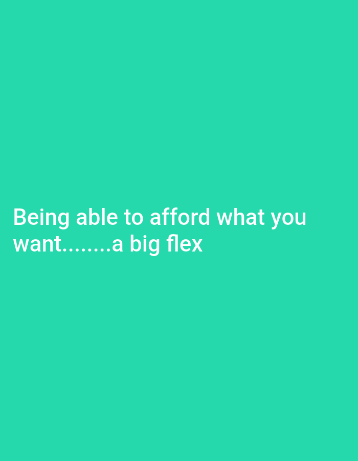 The image displays a solid teal-colored background with white, sans-serif text centered in the lower-middle section. The text reads: "Being able to afford what you want.........a big flex". No people, subjects beyond the text, physical objects, actions, or interactions are depicted. The environment is a digitally generated graphic, devoid of any discernible physical location, and provides no visual information to establish a location within Ukpor, Nigeria, or any other geographical area.