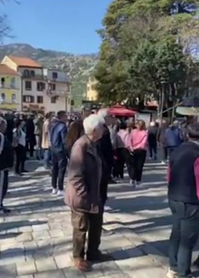 crowd of people gathered in a town square on a sunny day. Buildings with red tile roofs surround the square. Trees line the perimeter, and mountains are visible in the background. The camera moves through the crowd, showing people of various ages and ethnicities. Some people are talking to each other. The camera focuses on a stage set up in the square, where people are standing and speaking. A screen on the stage displays a logo. The video also shows a food truck in the square.