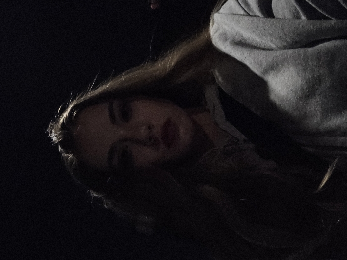 A young female, appearing light-skinned with long, light-brown hair, is centered in a dimly lit, dark environment