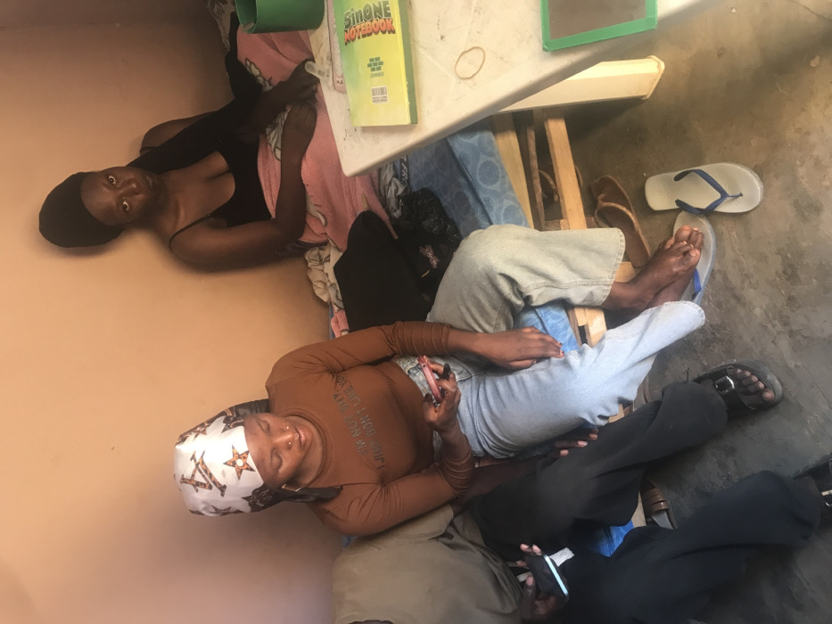 Three people sit in an indoor space. One woman lies on a bed with a notebook nearby. Another woman, wearing a headscarf and brown shirt, sits on a wooden chair and uses a phone. A third person also sits on the floor, using their own phone. Multiple pairs of sandals and flip-flops are on the floor, along with clothing items like pants and a black top. The walls are painted in a light peach color.