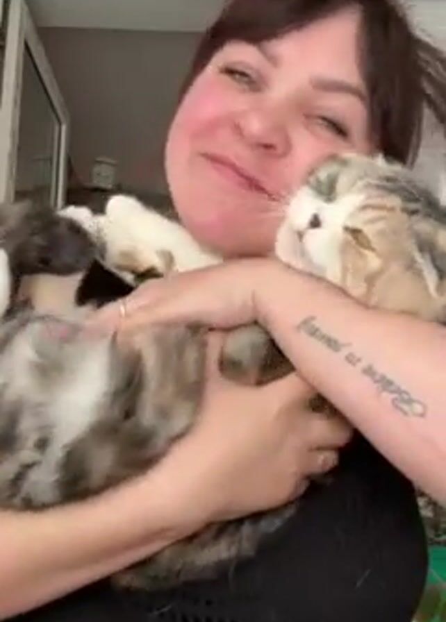 A woman with short brown hair and fair skin smiles at the camera while holding a multi-colored Scottish Fold cat. The woman wears a black top and a wedding ring on her left hand. She also has a tattoo on her left arm that reads "Believe in yourself." The cat has folded ears, light brown eyes, and a mixture of white, brown, black and tan fur. The background appears to be an indoor space with a window behind the woman. The lighting is bright and natural. The woman hugs the cat closely, and the cat looks relaxed and content.