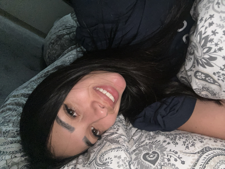 - "A woman with dark hair, dark eyes, and a bright smile is lying on patterned bedding" by FM-AazUv1, licensed under CC BY 4.0