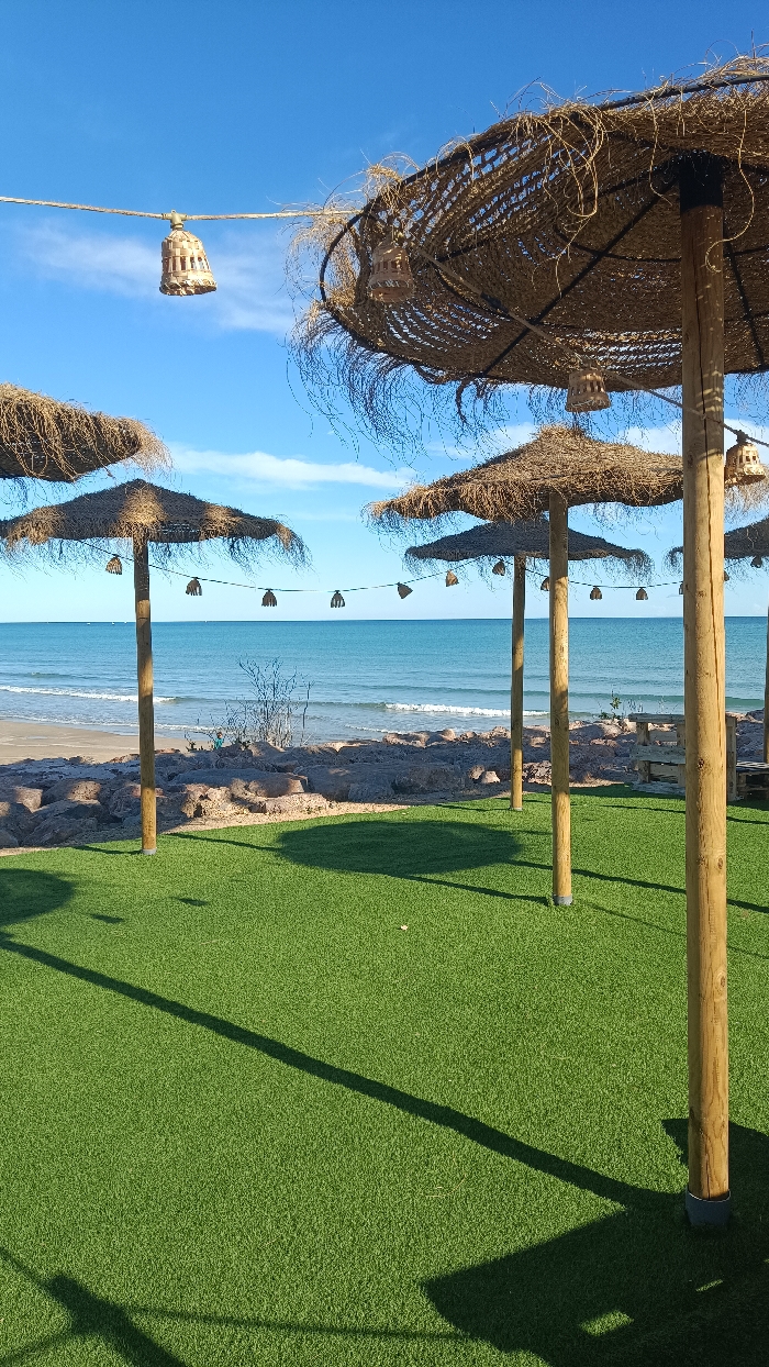 This image depicts a beachside leisure area, likely a section of a chiringuito or beach club, located in Sagunto, Spain