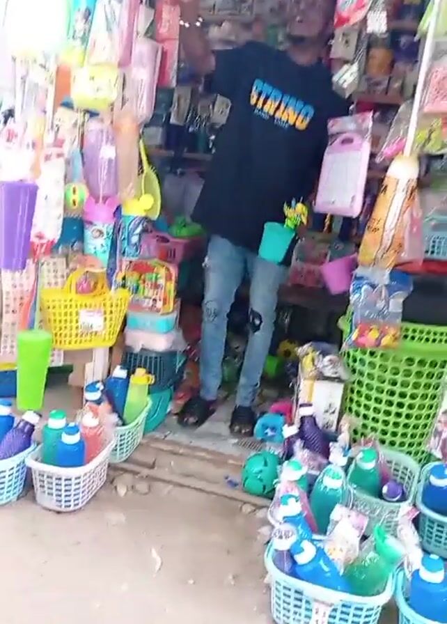 man standing in front of a small shop filled with various household items. He is wearing a black T-shirt with the word "STRING" printed on it and ripped blue jeans. He is standing in front of the shop, which is overflowing with plastic containers, baskets filled with cleaning supplies, toys, and other miscellaneous items. He is holding a small green cup and gesturing towards the items displayed in the shop. The ground is a mix of concrete and dirt. Music is playing in the background.