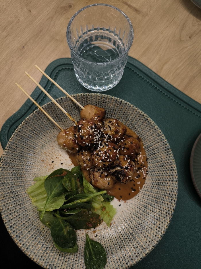 The image depicts a dining scene, described as being located in Vinnytsia, Ukraine. A speckled ceramic plate with a textured, dotted pattern holds three wooden skewers, each containing multiple small, spherical food items coated in a reddish-brown sauce. The items on the skewers are topped with a mix of white and black sesame seeds. Alongside the skewers, a portion of green leafy salad, including what appears to be spinach and lettuce, is present on the plate. Above and to the right of the plate, a clear glass with a decorative textured surface is filled with water. Both the plate and the glass rest upon a dark green, rectangular placemat featuring a raised, stitched border. The placemat is situated on a light-colored wooden table surface. A partial view of a second, dark-colored plate is visible on the far right edge of the frame. No individuals are present in the scene, and no specific actions or interactions are depicted beyond the presentation of the meal.