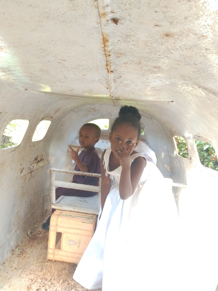 The image presents two children inside a weathered, white, metallic structure resembling an aircraft fuselage, located in Unknown, Unknown