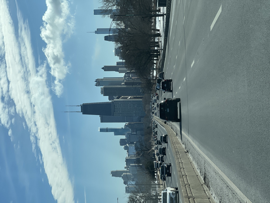 A view from a car shows a highway with traffic, set against the backdrop of the Chicago skyline under a bright, partly cloudy sky