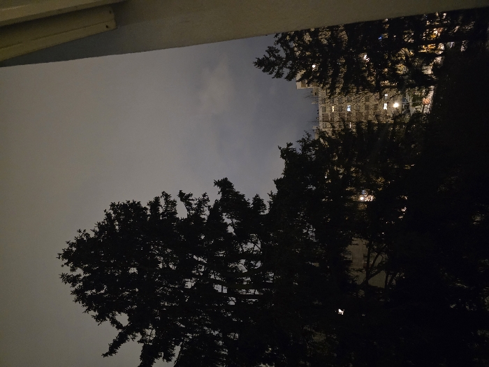 A low-angle shot shows the night sky through the dark silhouettes of trees. A tall building with many windows is visible in the upper right, partially obscured by tree branches. The sky is a mix of grey hues, suggesting an overcast or cloudy night. The overall composition is dark and moody.