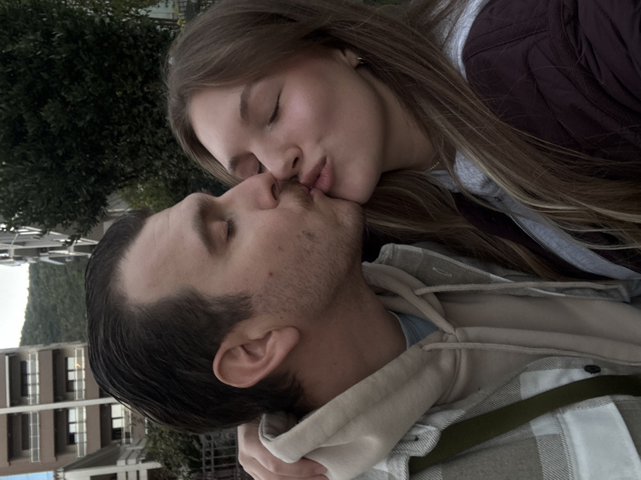 A close-up photograph depicts two individuals, an adult male and an adult female, engaged in a kiss, with their eyes closed